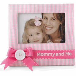 Pink gingham frame features grosgrain bow with button detail. Holds a 4x6 photo.
